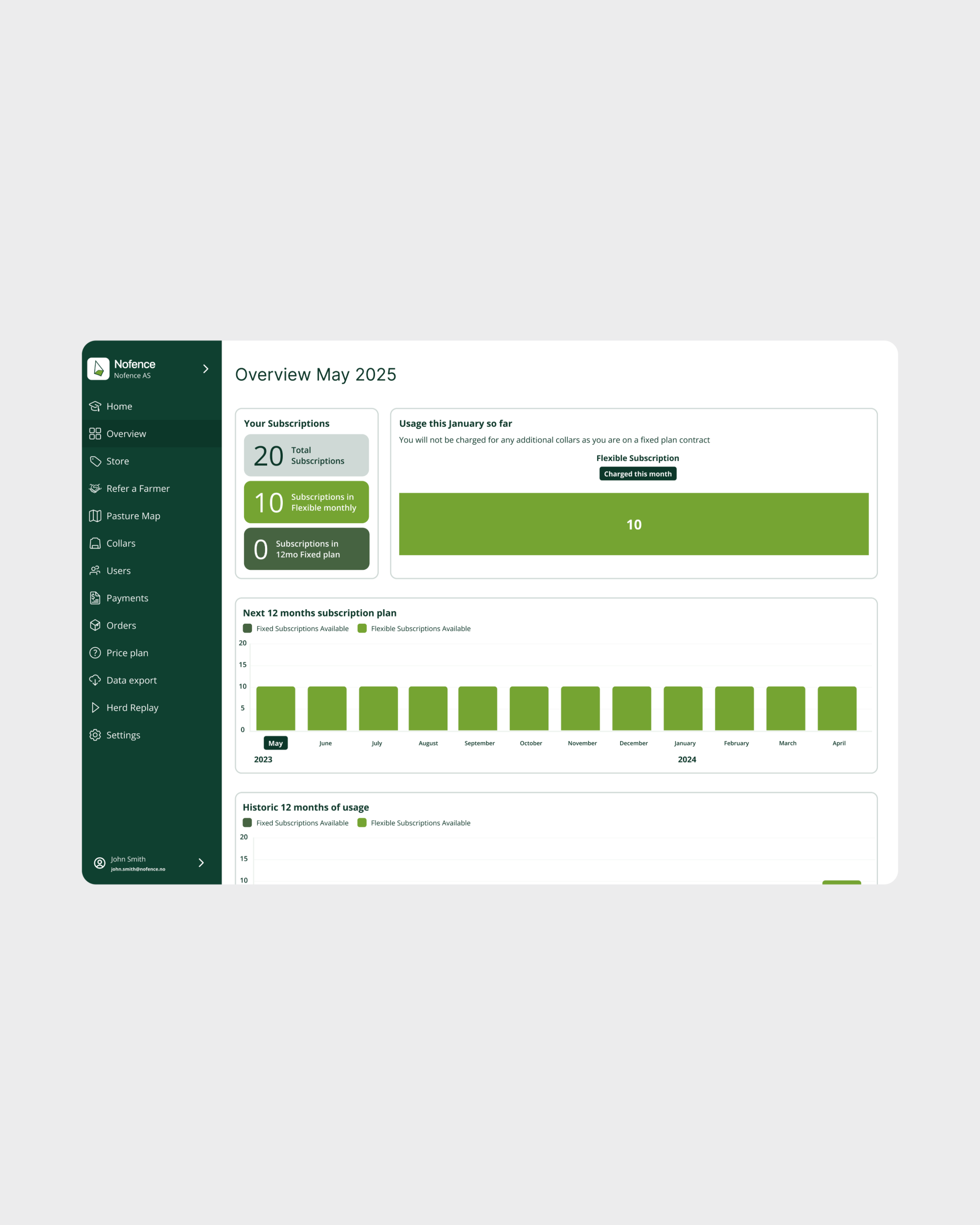 The Nofence account pages serve as the administrative hub of your virtual fencing system. While the mobile app handles day-to-day livestock management, the web portal gives you a complete overview of your operation from subscription management and team collaboration to data analysis and billing.
