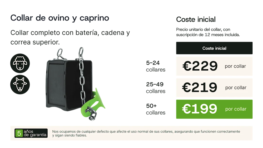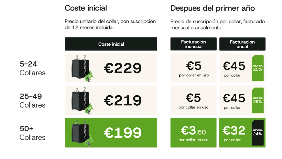 Consulta el precio del collar, qué incluye y las opciones de suscripción según el tamaño de tu rebaño.