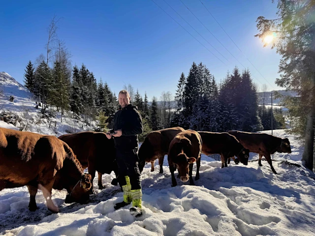 På Nedre Glosli gård i Nittedal bruker Kristian Forbord virtuelle gjerder for å gjøre beitehverdagen enklere og mer effektiv. Noen av dyrene hans går ute hele året med Nofence-klaver, men nå ser han frem til våren, når alle klavene kommer på.