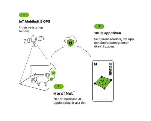 Varje fullvuxet djur bär ett soldrivet GPS-halsband. Du ritar upp gränser i mobilen och halsbandet håller djuret inom dem med hjälp av eskalerande ljudsignaler och, vid behov, en mild elstöt. De flesta djur lär sig att reagera på ljud enbart inom några dagar.